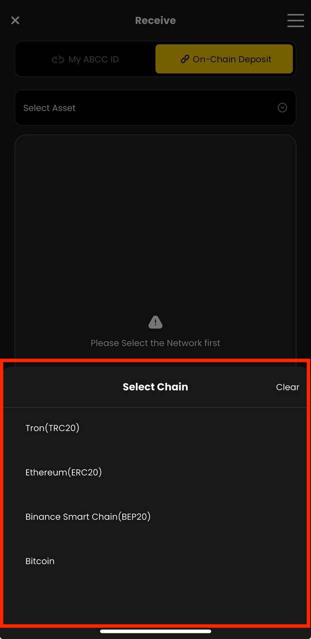 - On-chain Deposit : Select the chain first and then you can deposit using the tokens as listed on the app.