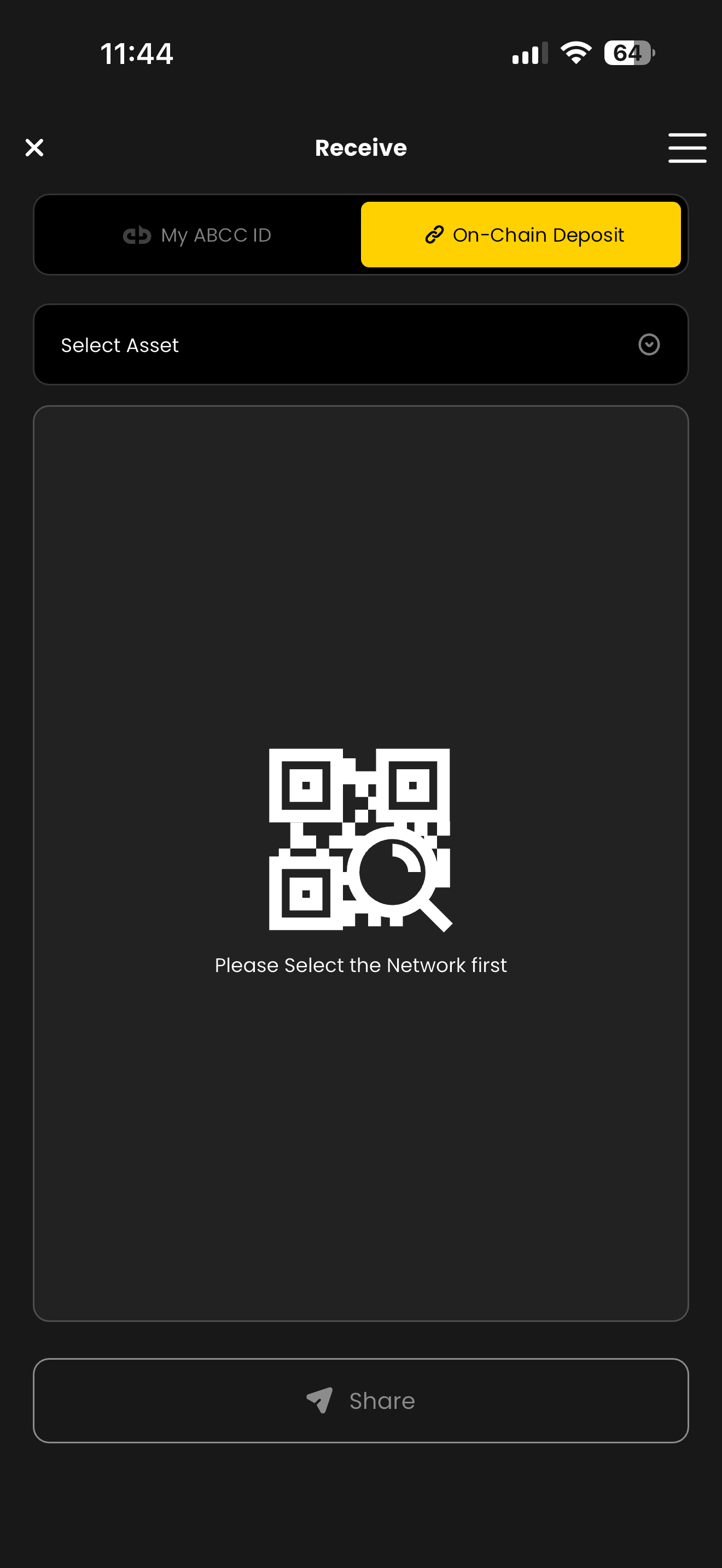 Deposit to ABCC ID: "My ABCC ID" allows you to trade with other users who also have the ABCC Wallet. Simply share your ABCC Wallet QR code with other ABCC Wallet users. They can scan it to initiate transactions directly with you.