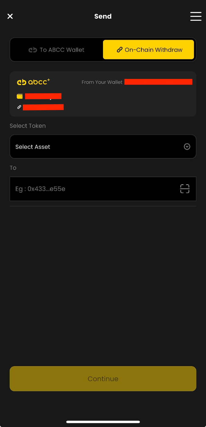Step 2: Select sending token to Another Person's ABCC Wallet or making an On-Chain Withdrawal
