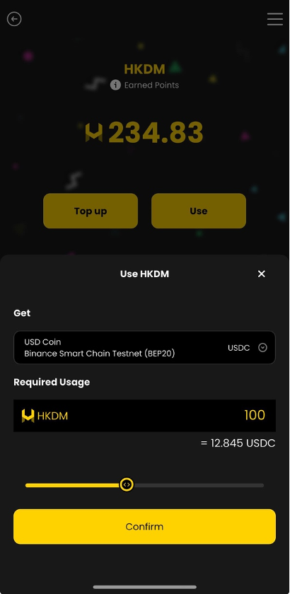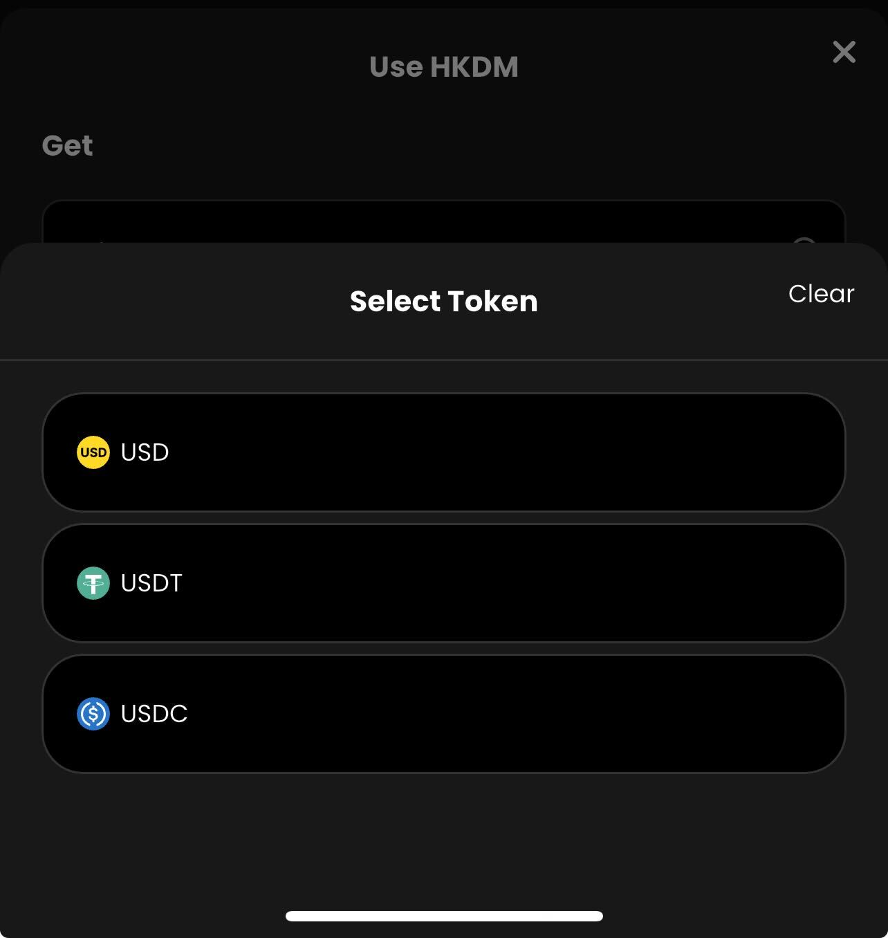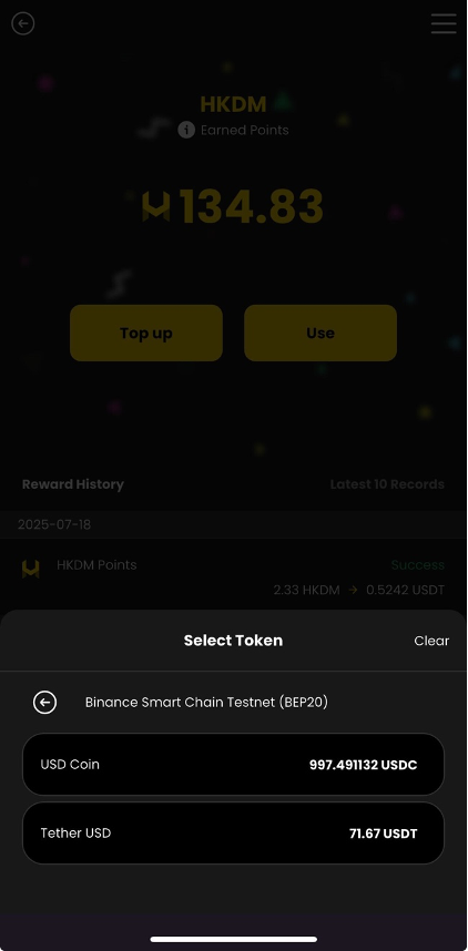 i. Use the tokens in your account for swaps. Currently, we support swapping HKDM points by using USDT and USDC on the Binance Smart Chain.