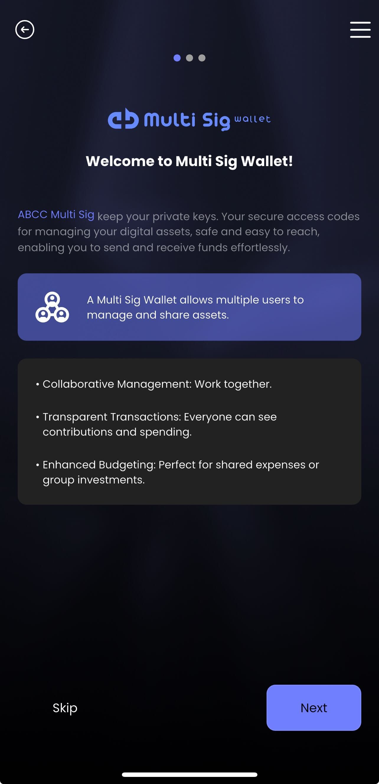 Once you have created a wallet, you can click "Add Multi-Sig" below your main wallet. You can click "Next" to read the introduction or click "Skip" to move on.