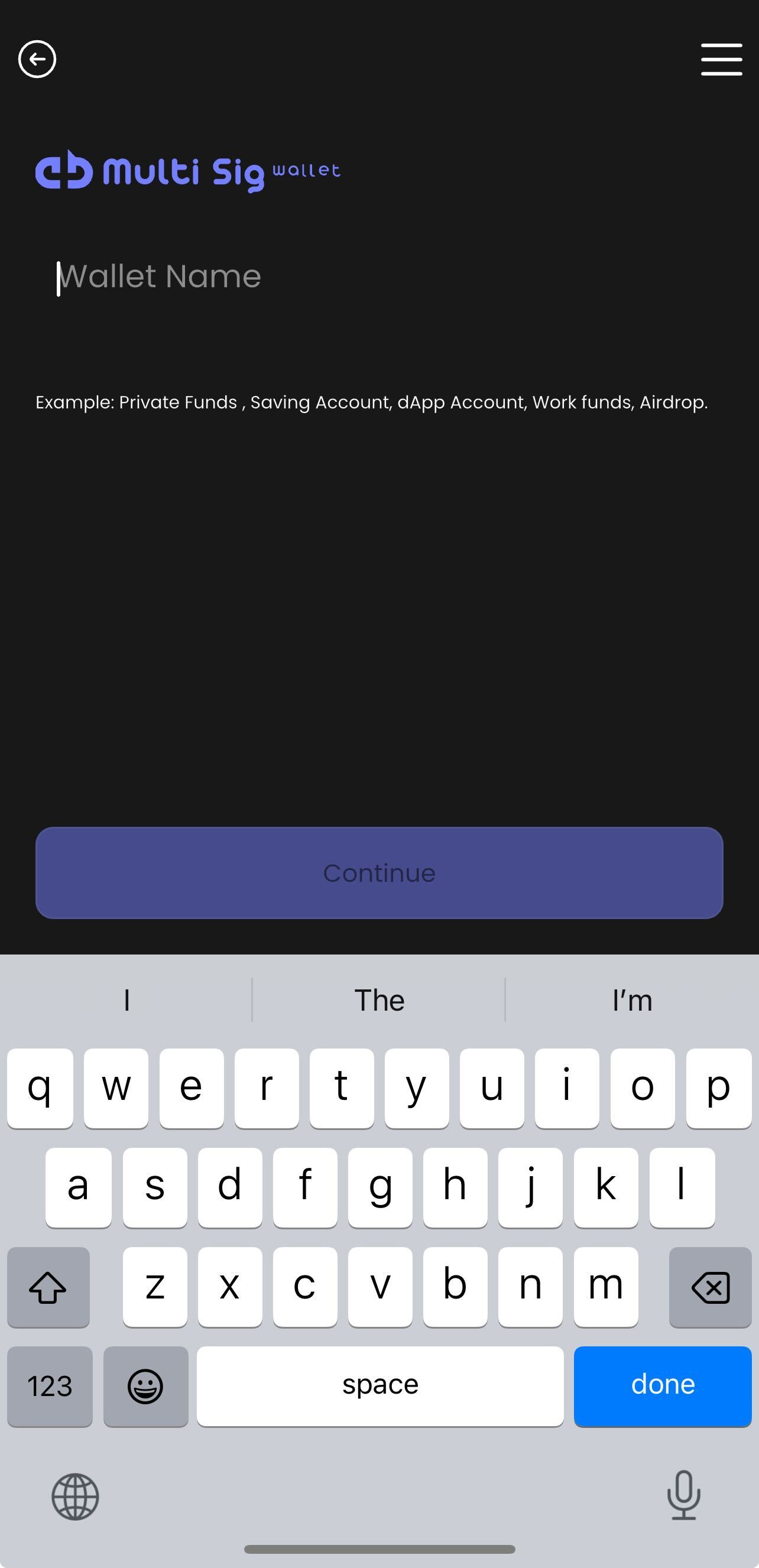 i. First, please name the wallet and then click "Continue".