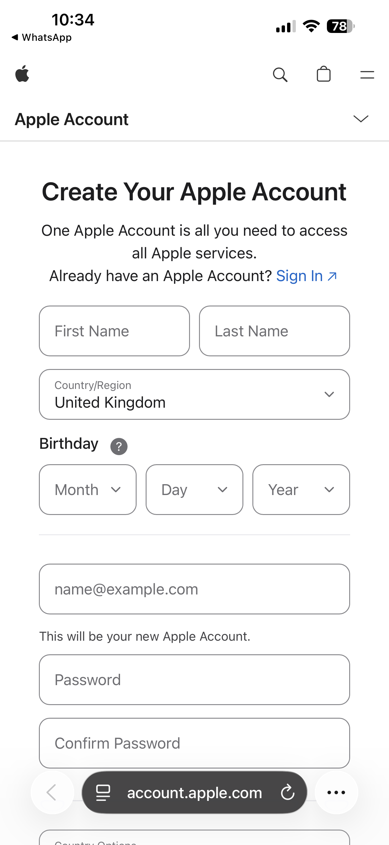 i. Visit Apple's official website at https://appleid.apple.com/account to create your Apple account. Select your region and fill in your personal information and email address.