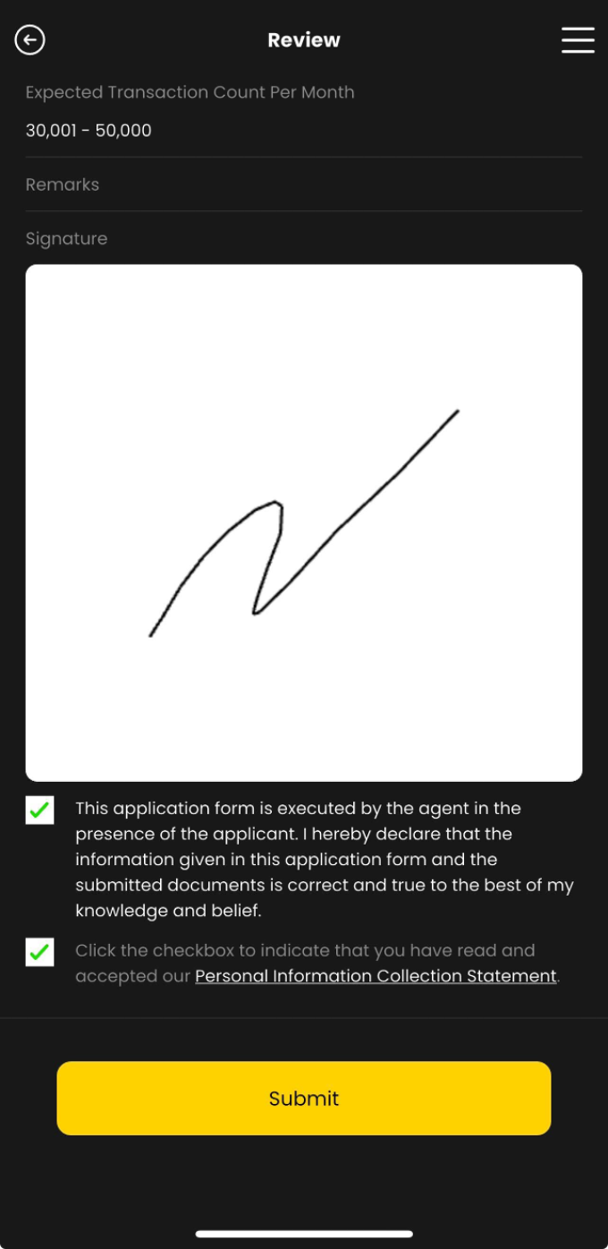 Review the information again, then click "Submit." Please sign and click "Confirm."