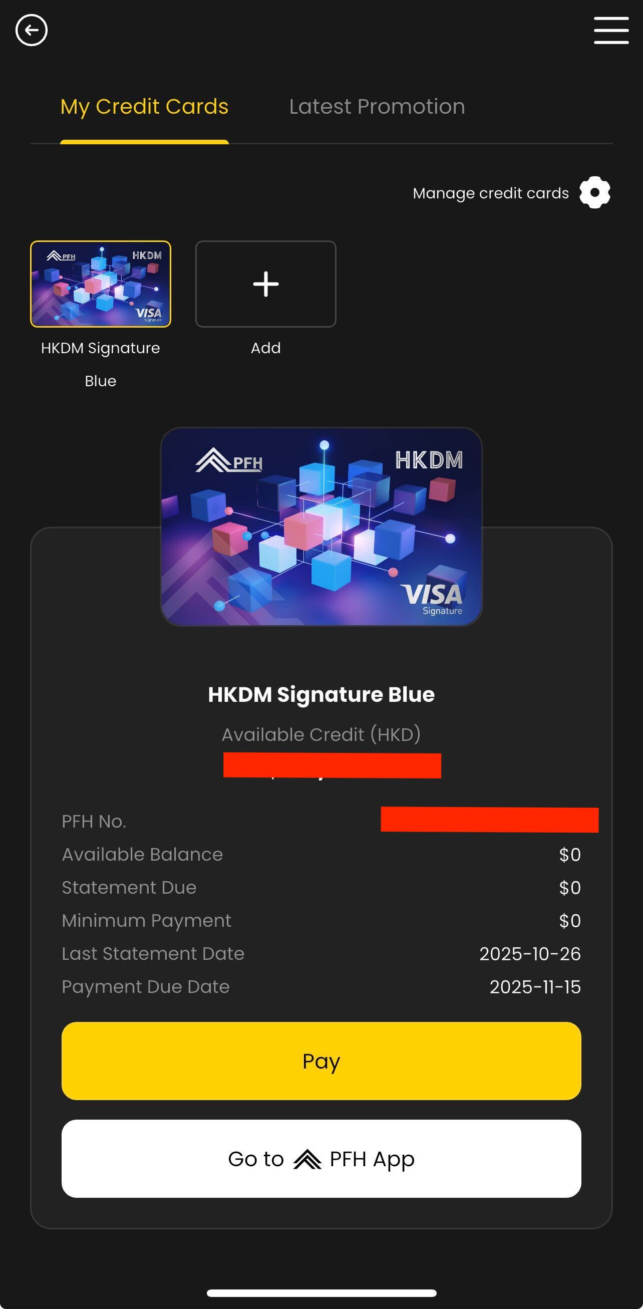 Once the binding is complete, you can use this credit card for payments or go directly to the PFH app to make transactions.