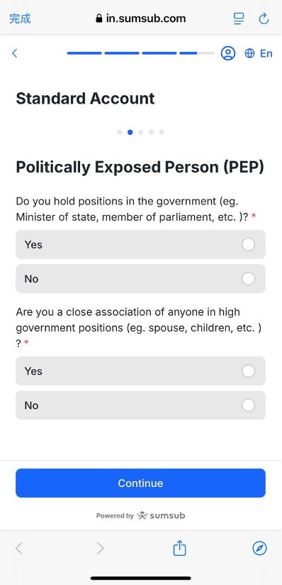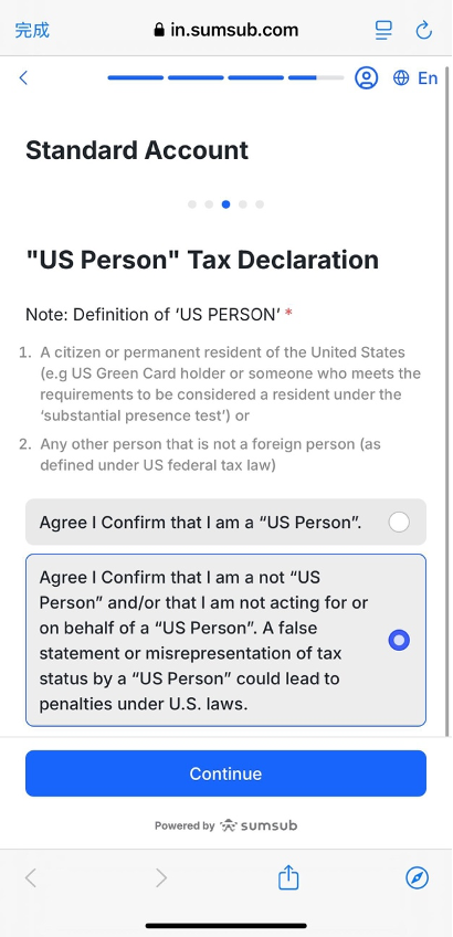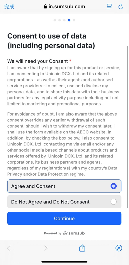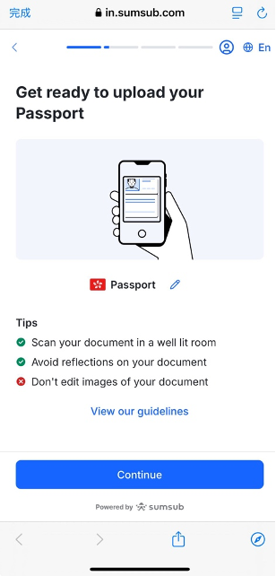 前往 SUMSUB 网页。点击「继续」开始 KYC 流程。