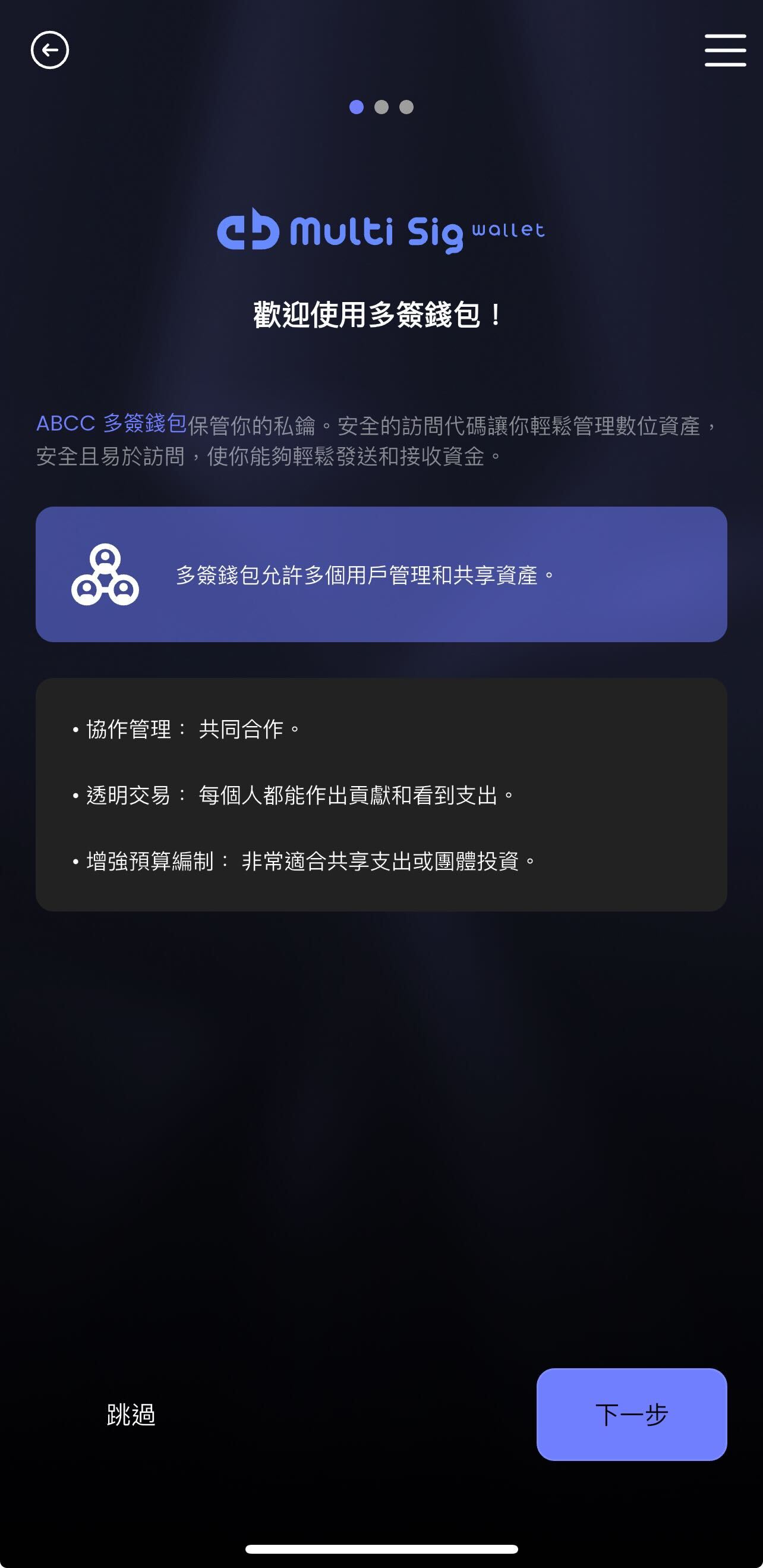注册钱包后,您可以点击主钱包下方的「新增Multi-Sig Wallet」。您可以点选「下一步」阅读「加入多签钱包」的介绍,或点选「跳过」继续。