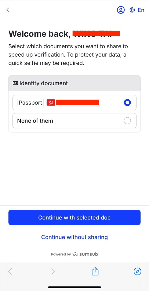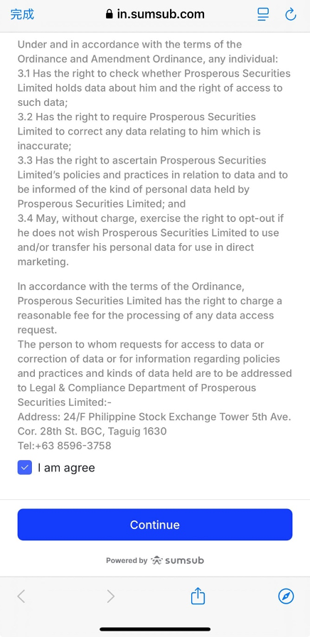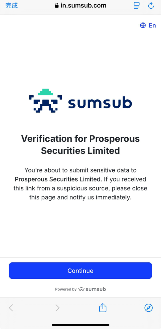 ii. 系统将自动将您重新导向至 Sumsub 平台进行身份验证,然后点选「继续」。