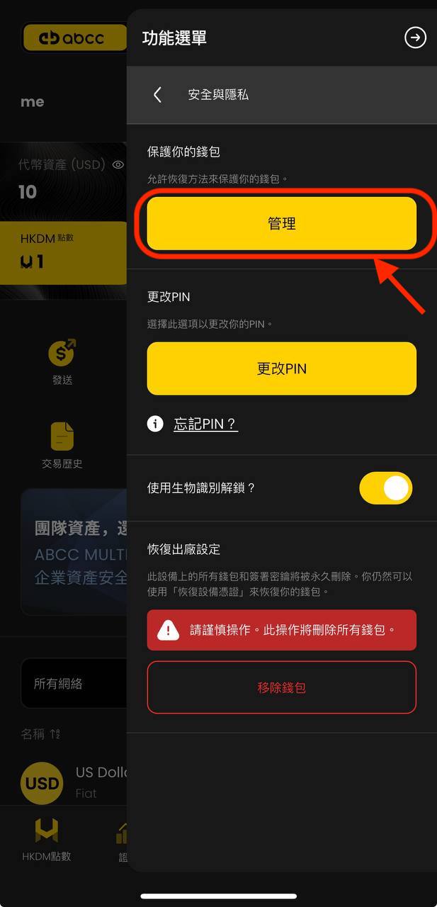 如果您已经登入您的钱包帐户,您也可以从侧边选单建立另一个恢复设备凭证。请点选右上角,选择「安全与隐私权」。然后,您可以点击“管理”,添加恢复设备凭证,并按照步骤 1A 建立新的恢复 QR 码。