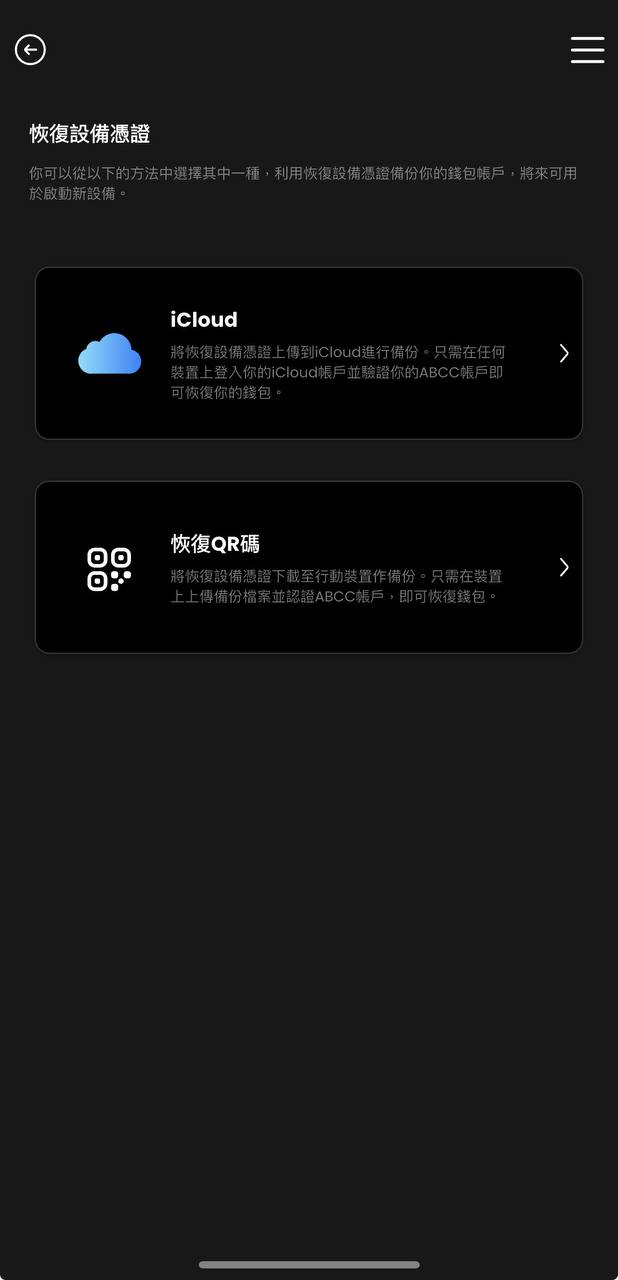 成功注册帐户并设定 PIN 后,您需要选择一种方法来备份您的钱包帐户。根据您装置的作业系统(iOS 或 Android),有两种备份方法可供选择:iCloud/Google Drive 和恢复QR 码。