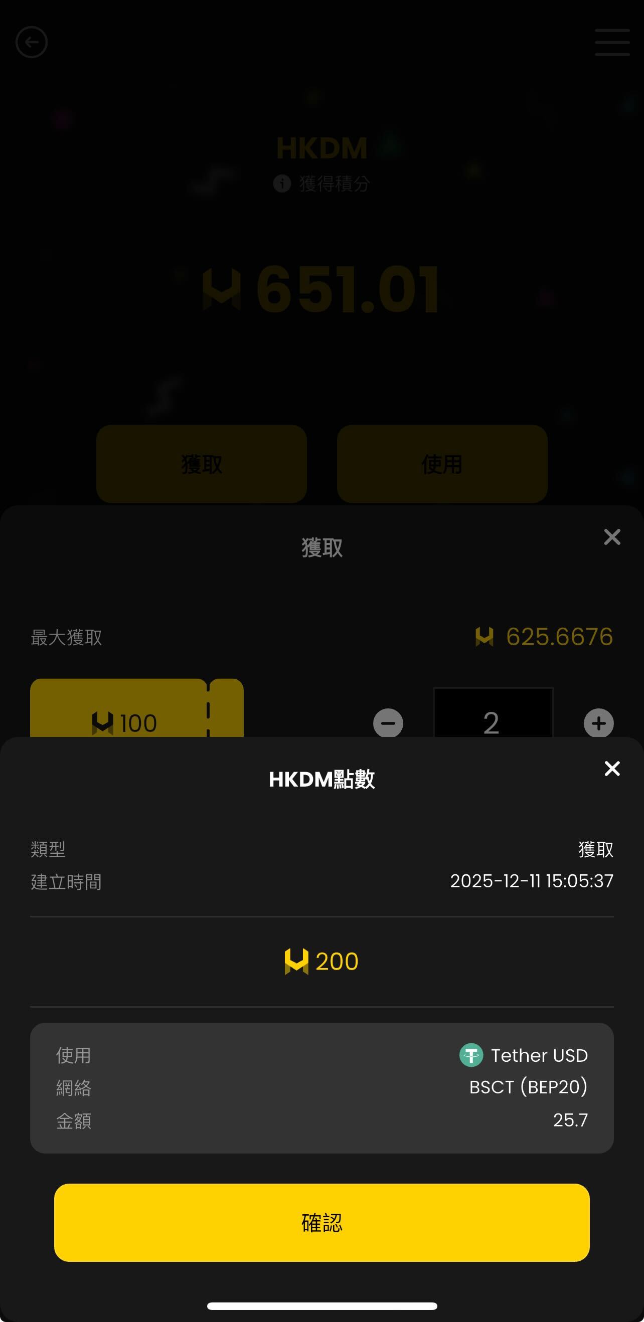 iii. 選擇所需的HKDM積分數量後,點選「確認」。然後,使用您的PIN碼或生物辨識驗證進行雙重確認。完成後,系統將顯示一則訊息通知您。