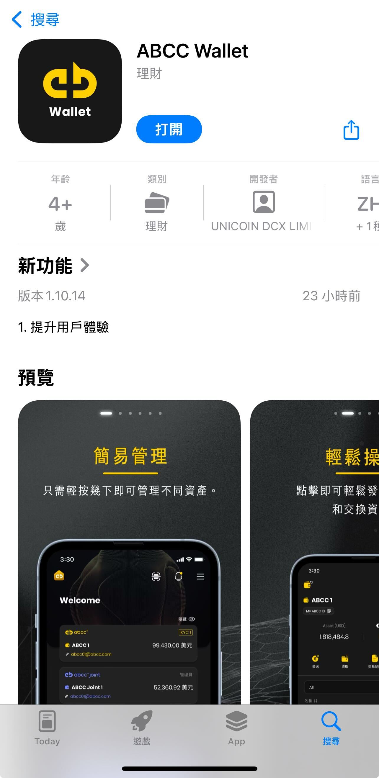 ii. 登入成功後,點選 "搜尋",輸入 "ABCC Wallet",點選 "取得"。下載成功後即可開啟APP及開始使用。