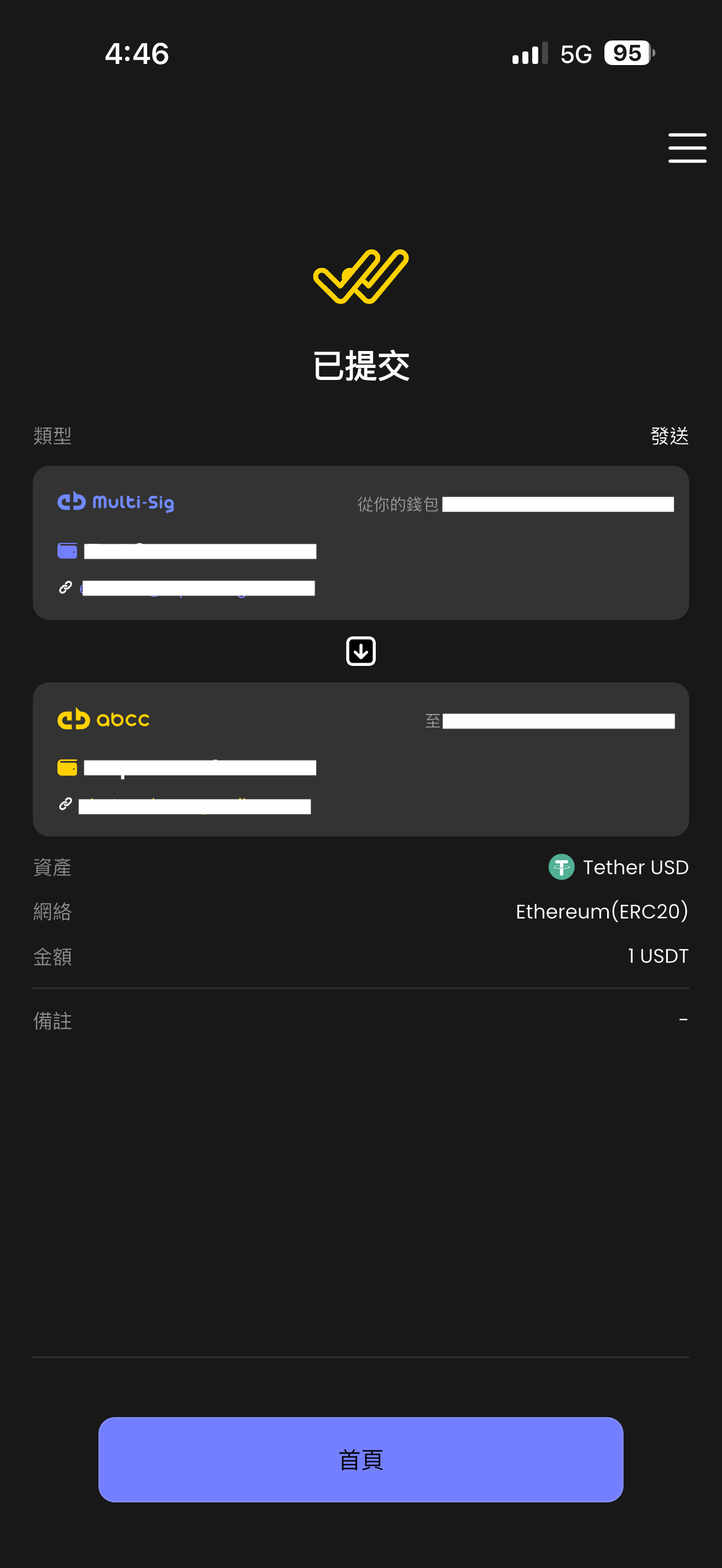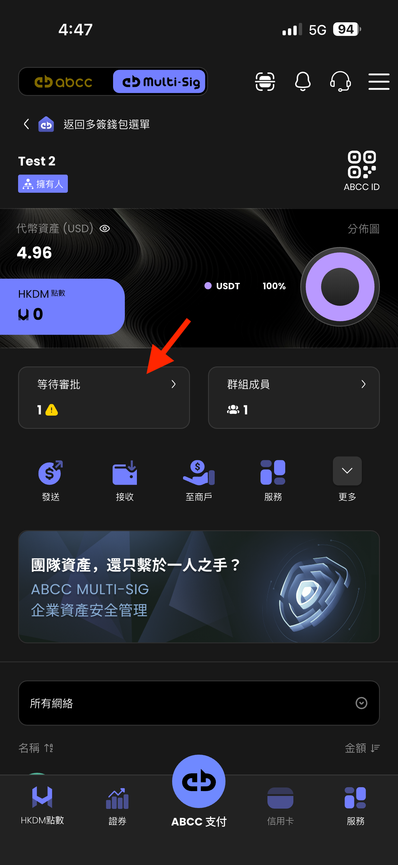 i. 提交後,主選單中將顯示等待審批的申請。此多簽錢包的所有成員均可查看該申請。審批者可以點選「等待審批」進行操作。