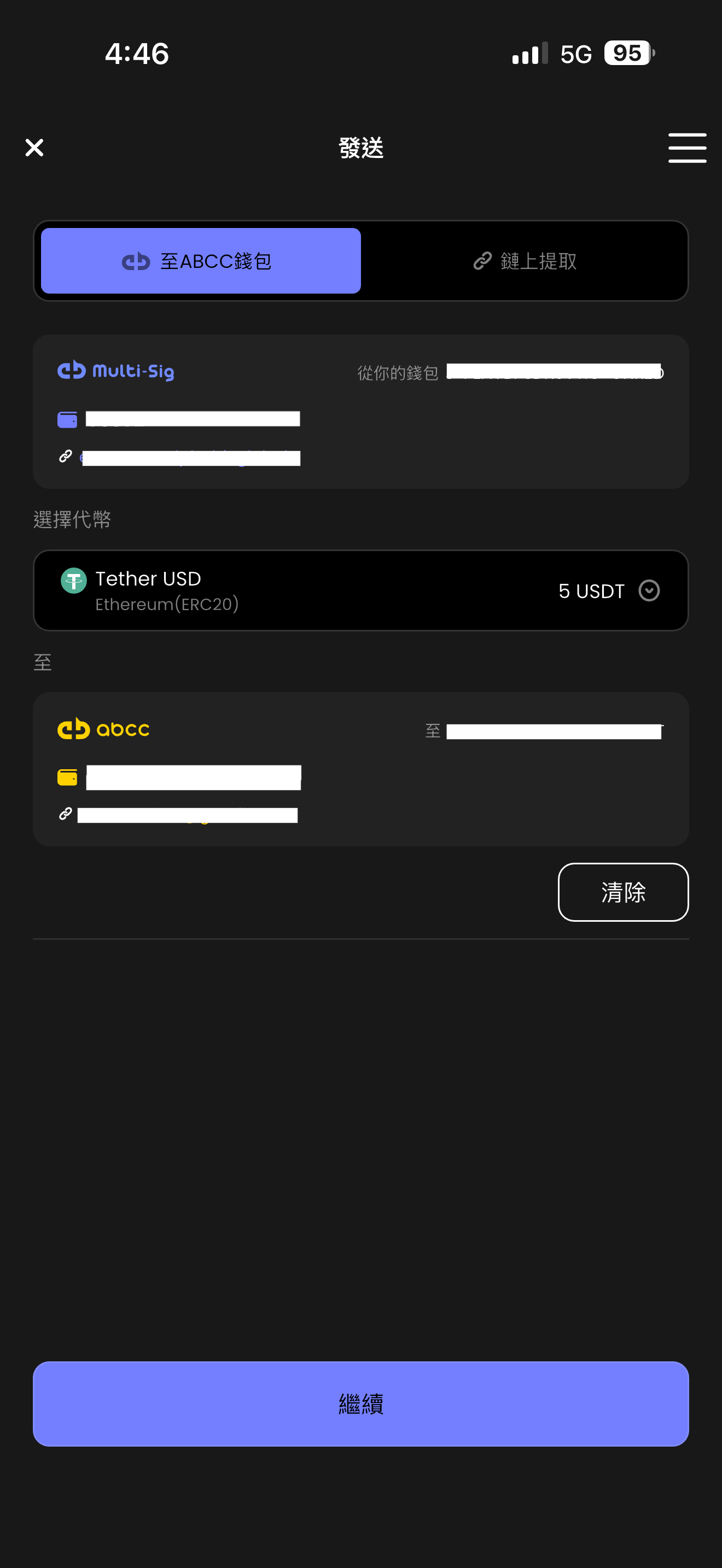i. 您可以透過輸入或掃描對方的 ABCC ID 來發送代幣。或者,您也可以選擇鏈上提取。